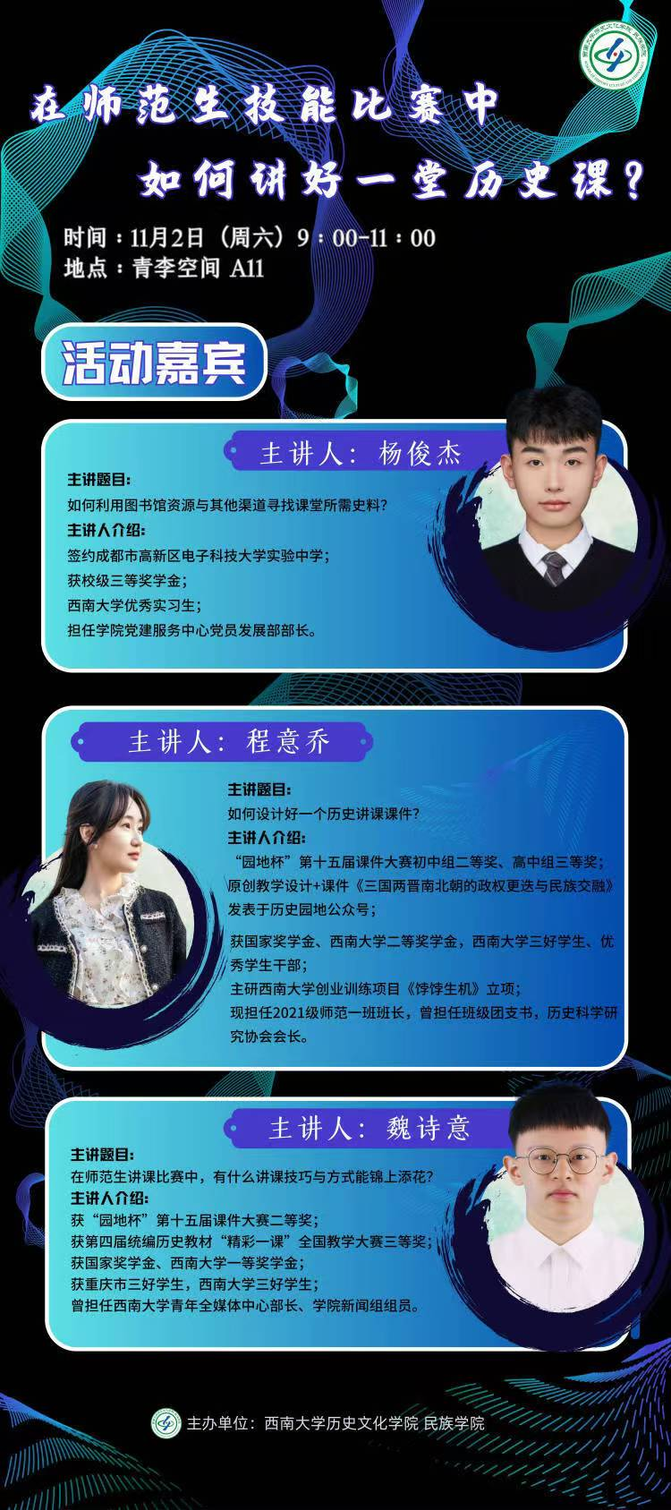 为进一步提升师范生专业技能与课堂实践能力,回应新老生交流会后同学们的意见反馈。在团委员工组织支持下,教育素质发展中心部门特邀21级优秀师范生同学,以微型沙龙的形式就同学们最期待的主题进行经验分享。