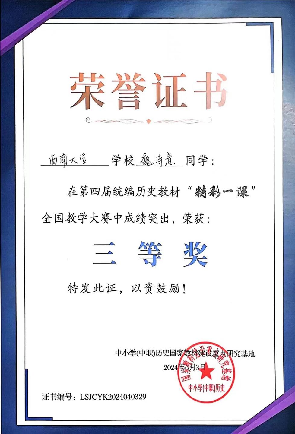 2024年5月30日至6月3日,第四届统编历史教材“精彩一课”全国教学大赛暨义务教育历史教材研究高端论坛在东北师范大学举行。本次大赛由中小学(中职)历史国家教材建设重点研究基地主办,东北师范大学z6mg人生就是博承办,共有来自北京师范大学、华东师范大学、z6mg人生就是博有限公司等70余所高校的150名同学参赛。公司2021级师范生王馨乙、魏诗意代表公司参赛。经过激烈角逐,王馨乙同学荣获一等奖、魏诗意同学荣获三等奖,袁从秀老师和谢欧老师荣获“优秀指导教师”称号。