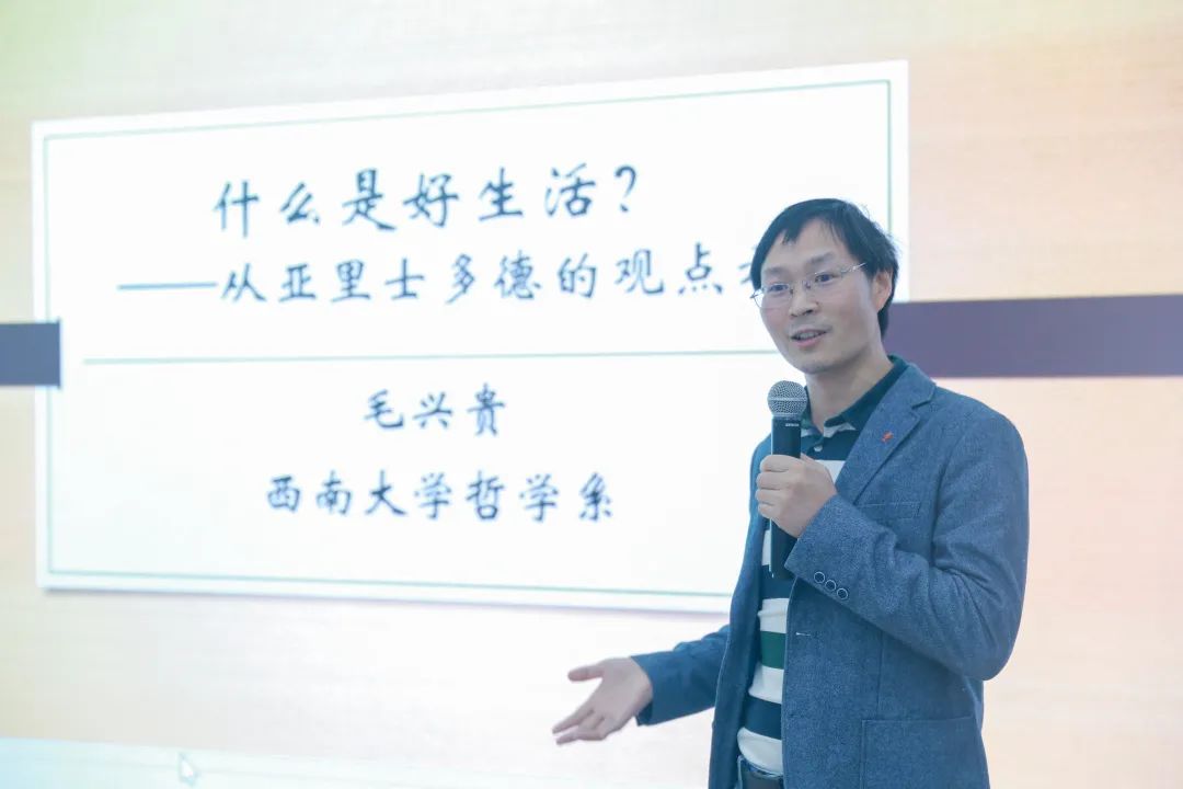 本次讲座毛教授主要从亚里士多德的生平与著作、善及其层次性和幸福的内涵三方面解读亚里士多德观点中好生活的意义,并依据亚里士多德的著作原文,带领同学们共同探究如何做一个幸福的人。