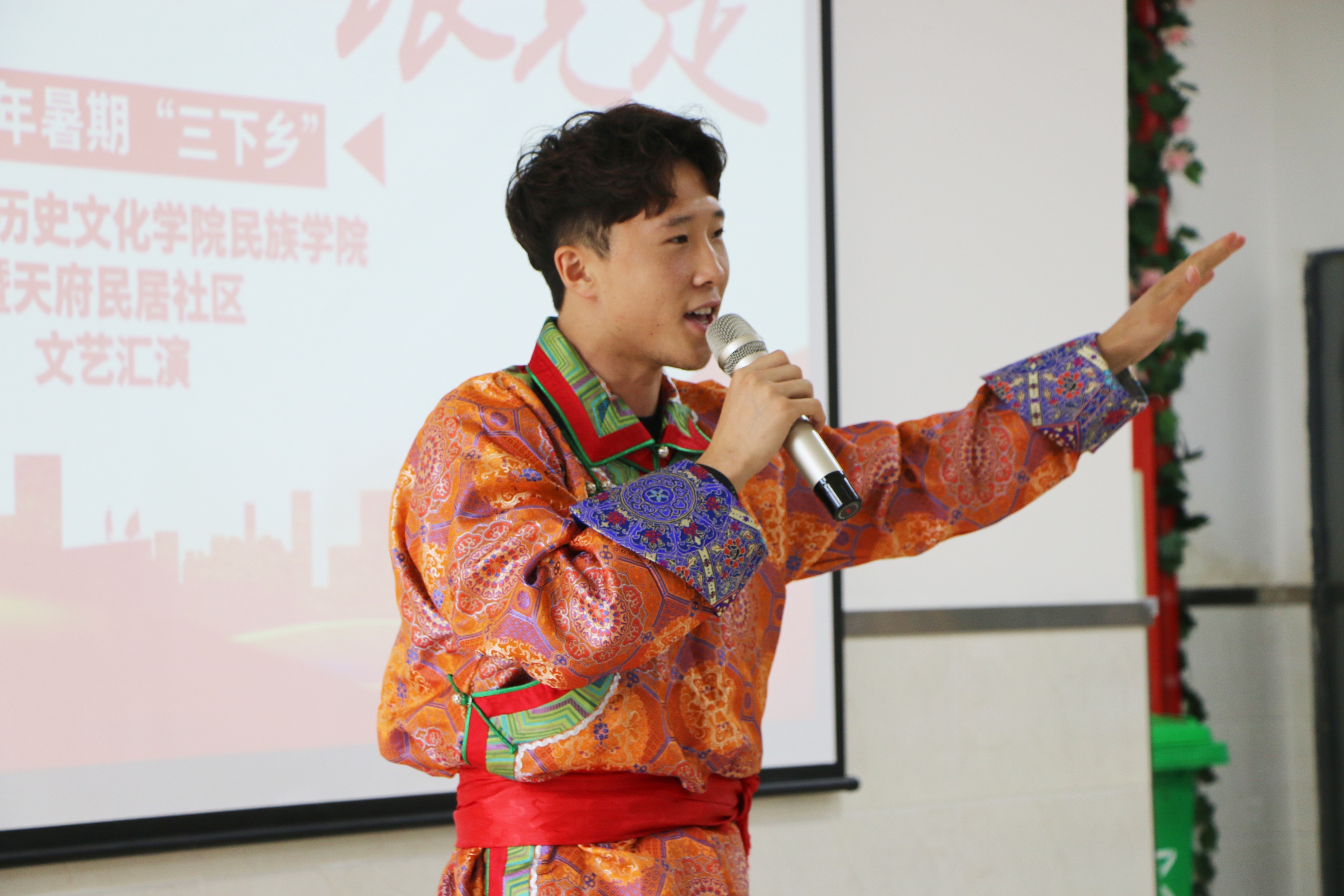 民族团结之花,绽放在中国大地,绽放在所有民族人民心间。中国共产党,对于少数民族同胞们而言,也如同母亲一般,呵护各民族的成长。蒙古族同学希力德格为大家带来蒙语歌曲《母爱之灵》,歌颂党如母亲般的坚韧。之后实践团的其他少数民族同学又带来了《民族风情》舞蹈表演,她们身着不同民族的传统服饰,以独特风格,将各民族的优秀文化传播到更广阔的大地上。