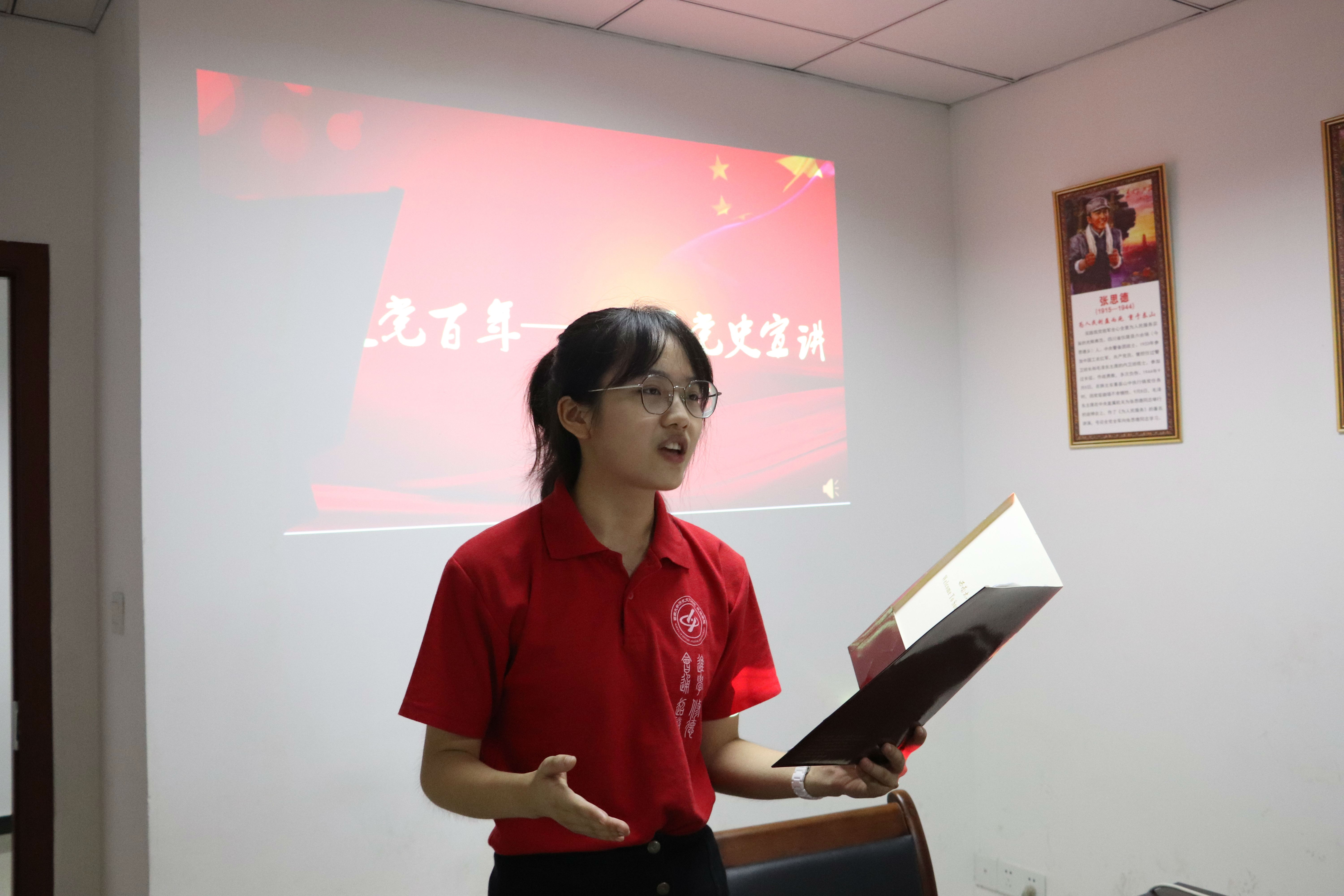 刘芮宏同学带领着社区居民一同回顾了“浴血中华,开天辟地”的建党、建国、建军的那段峥嵘岁月。刘宇轩同学深情朗诵了红岩组诗,诗中述说的是中国共产党革命先驱们的赤诚之心与报国之志。 王珺同学带领着居民们走进了“曲折探索,奠基伟业”的建国初期到改革开放的岁月。樊美静同学介绍“改革开放,继往开来”的新的历史征程,她从深圳今昔对比着眼,为居民们讲述了改革开放所带来的巨大成果。