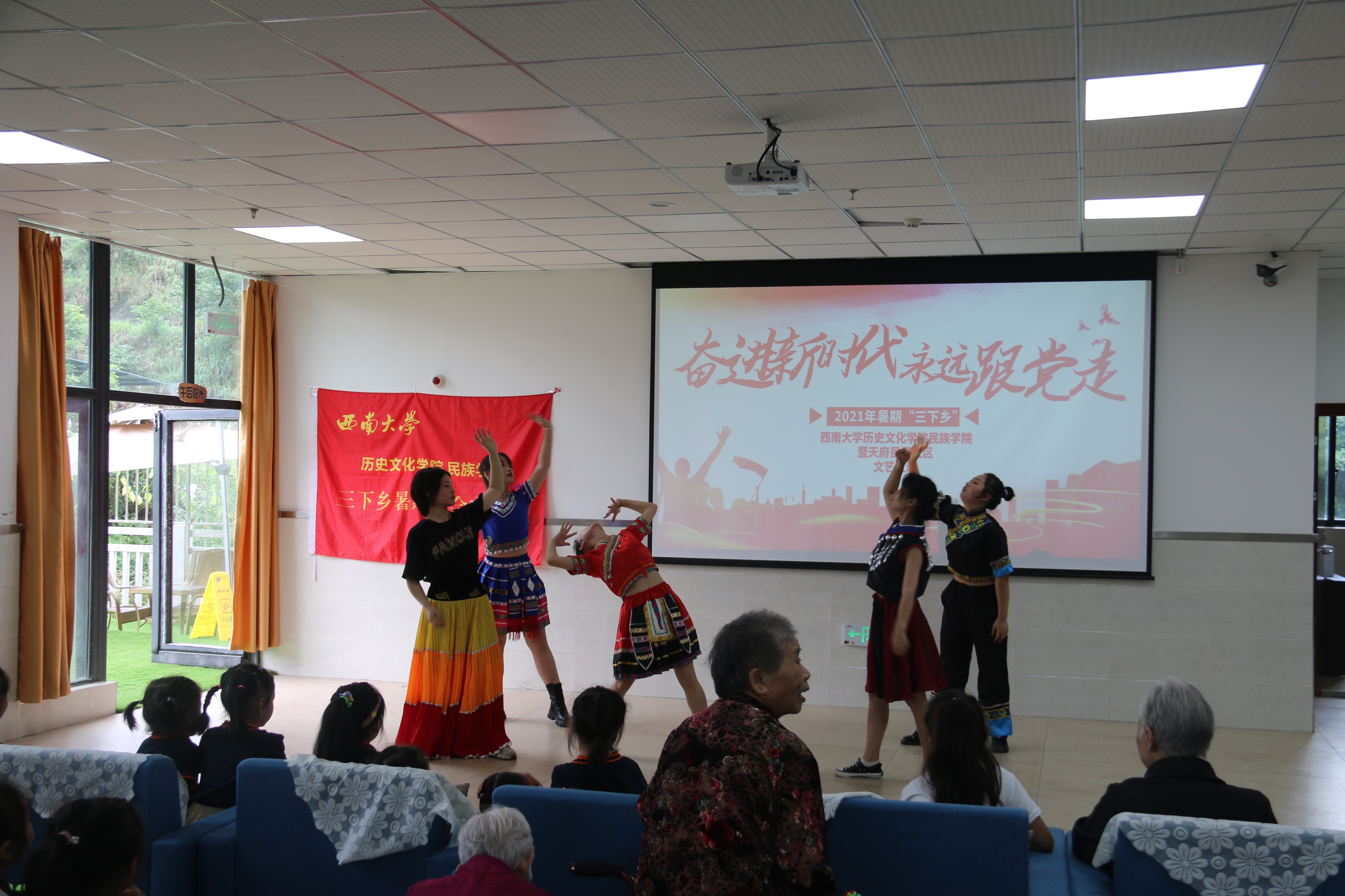 (图为实践团成员表演少数民族舞蹈节目 陶雨欣/供图)