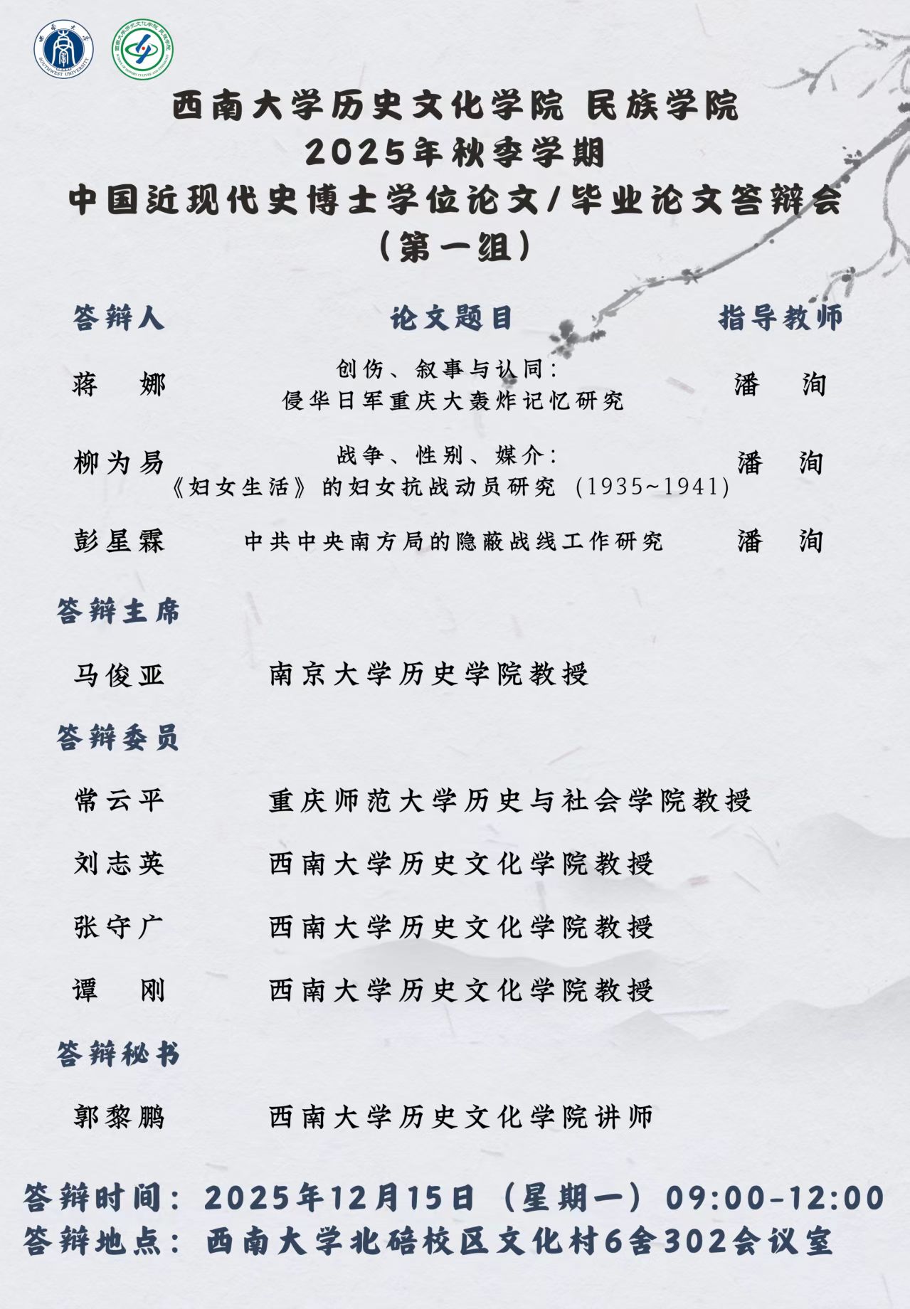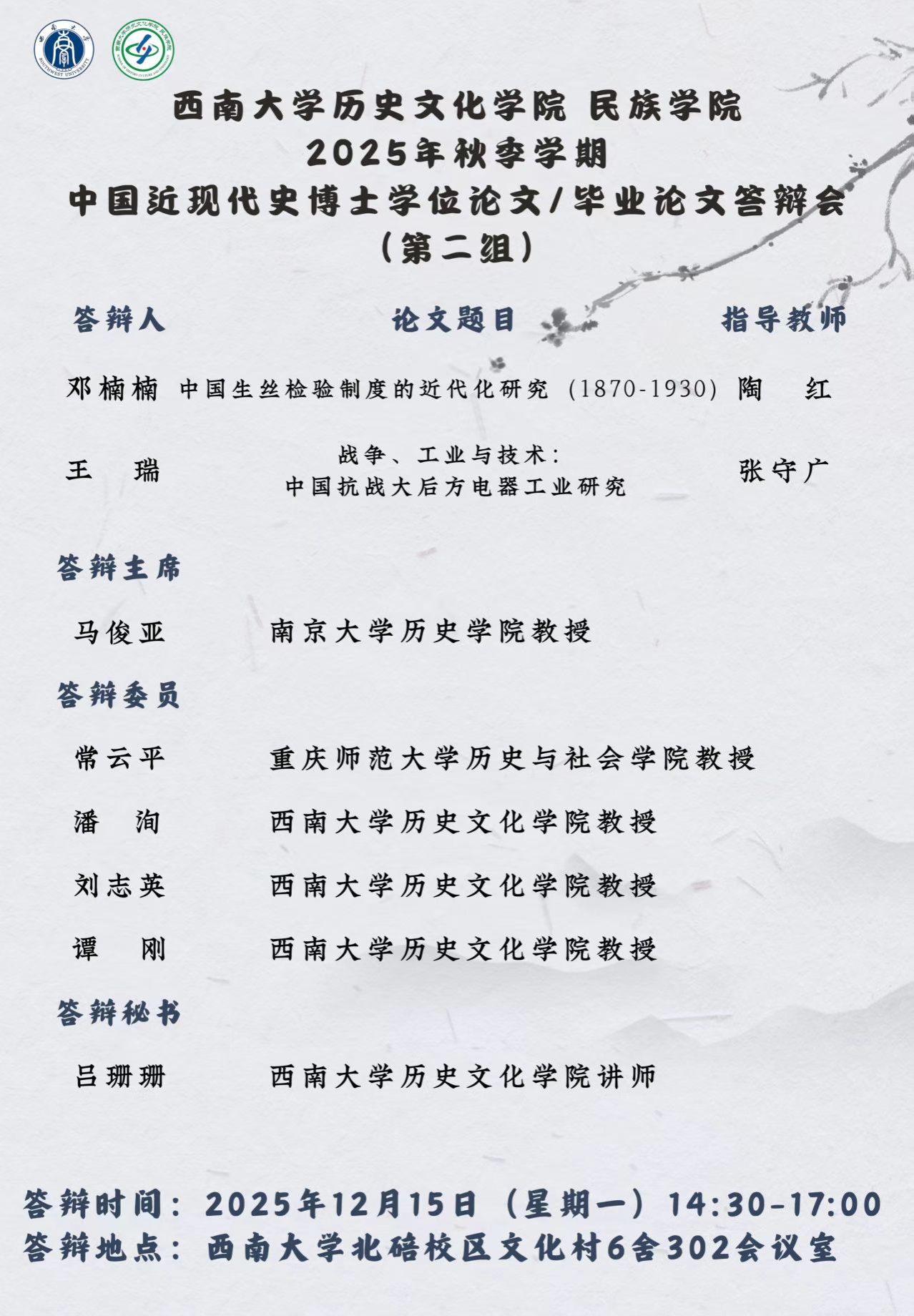 2025年秋季学期中国近现代史博士学位论文/毕业论文答辩会