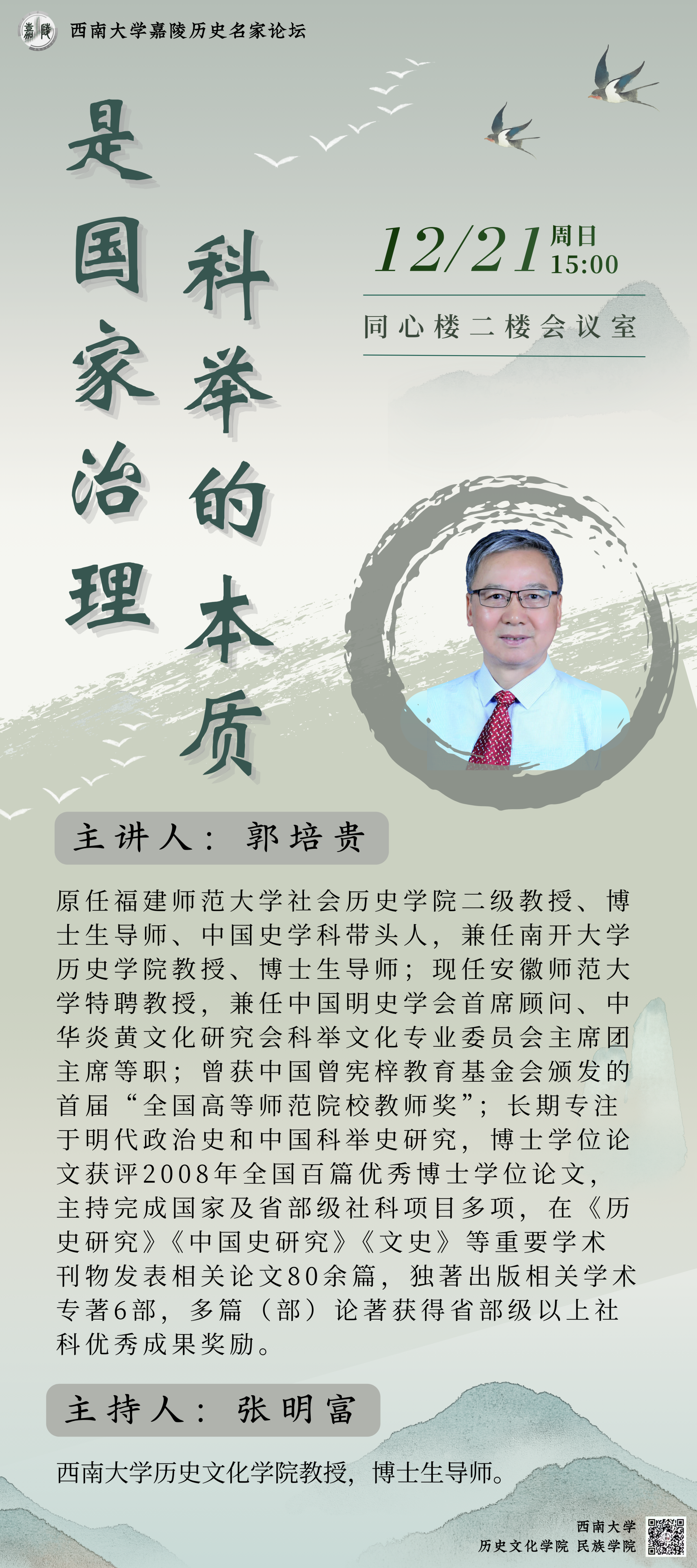 郭培贵,原任福建师范大学社会历史公司二级教授、博士生导师、中国史学科带头人,兼任南开大学历史公司教授、博士生导师;现任安徽师范大学特聘教授,兼任中国明史学会首席顾问、中华炎黄文化研究会科举文化专业委员会主席团主席等职;曾获中国曾宪梓教育基金会颁发的首届“全国高等师范院校教师奖”;长期专注于明代政治史和中国科举史研究,博士学位论文获评2008年全国百篇优秀博士学位论文,主持完成国家及省部级社科项目多项,在《历史研究》《中国史研究》《文史》 等重要学术刊物发表相关论文80余篇,独著出版相关学术专著6部,多篇 (部) 论著获得省部级以上社科优秀成果奖励。