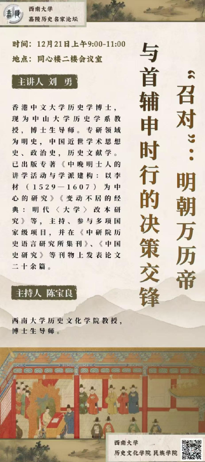 刘勇,香港中文大学历史学博士,现为中山大学历史学系教授,博士生导师。专研领域为明史,中国近世学术思想史、政治史,历史文献学。已出版专著《中晚明士人的讲学活动与学派建构:以李材(1529-1607)为中心的研究》《变动不居的经典:明代〈大学〉改本研究》等,主持、参与多项国家级项目,并在《中研院历史语言研究所集刊》、《中国史研究》等刊物上发表论文二十余篇。
