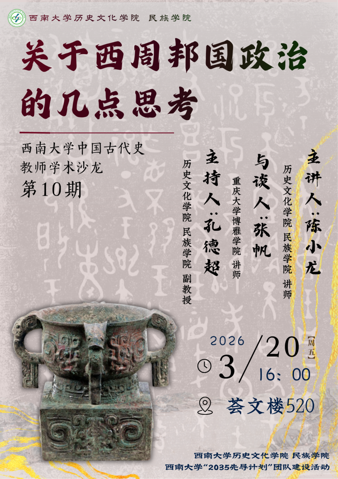 陈小龙,四川德阳人,现为z6mg人生就是博讲师,博士毕业于复旦大学出土文献与古文字研究中心。专业方向为出土文献与先秦史,在《中国史研究》《东岳论丛》等刊物发表学术论文多篇,主持国家社科基金青年项目一项。