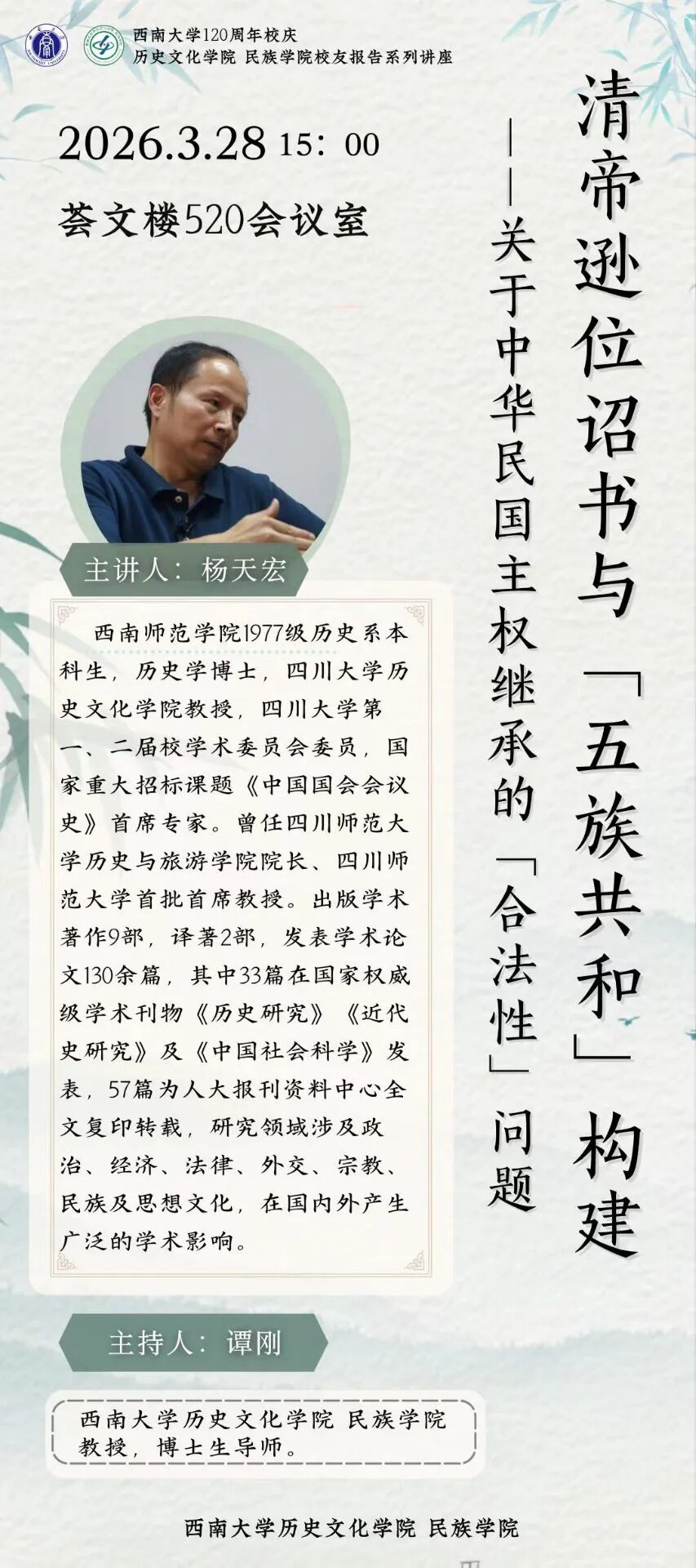 杨天宏,西南师范公司1977级历史系本科生,历史学博士,四川大学z6mg人生就是博教授,四川大学第一、二届校学术委员会委员,国家重大招标课题《中国国会会议史》首席专家。曾任四川师范大学历史与旅游公司经理、四川师范大学首批首席教授。出版学术著作9部,译著2部,发表学术论文130余篇,其中33篇在国家权威级学术刊物《历史研究》《近代史研究》及《中国社会科学》发表,57篇为人大报刊资料中心全文复印转载,研究领域涉及政治、经济、法律、外交、宗教、民族及思想文化,在国内外产生广泛的学术影响。