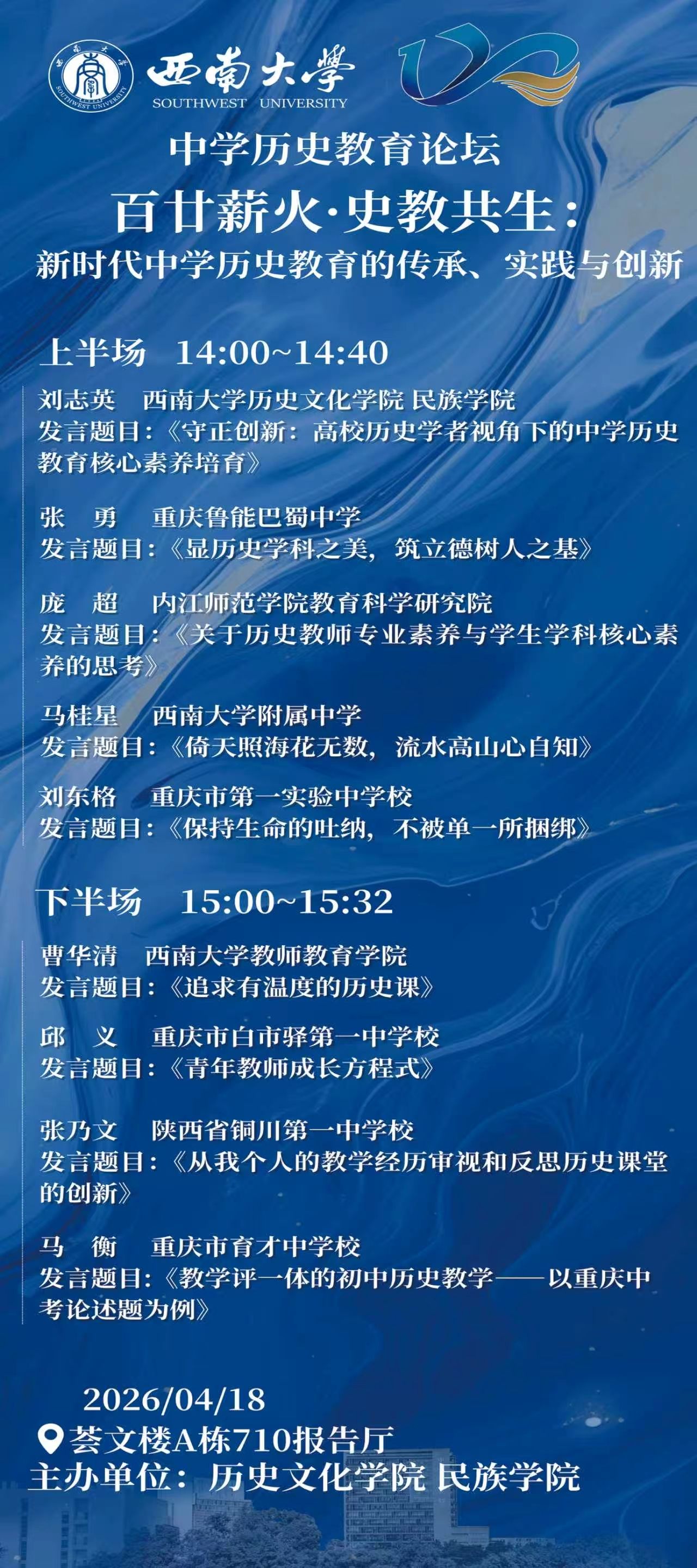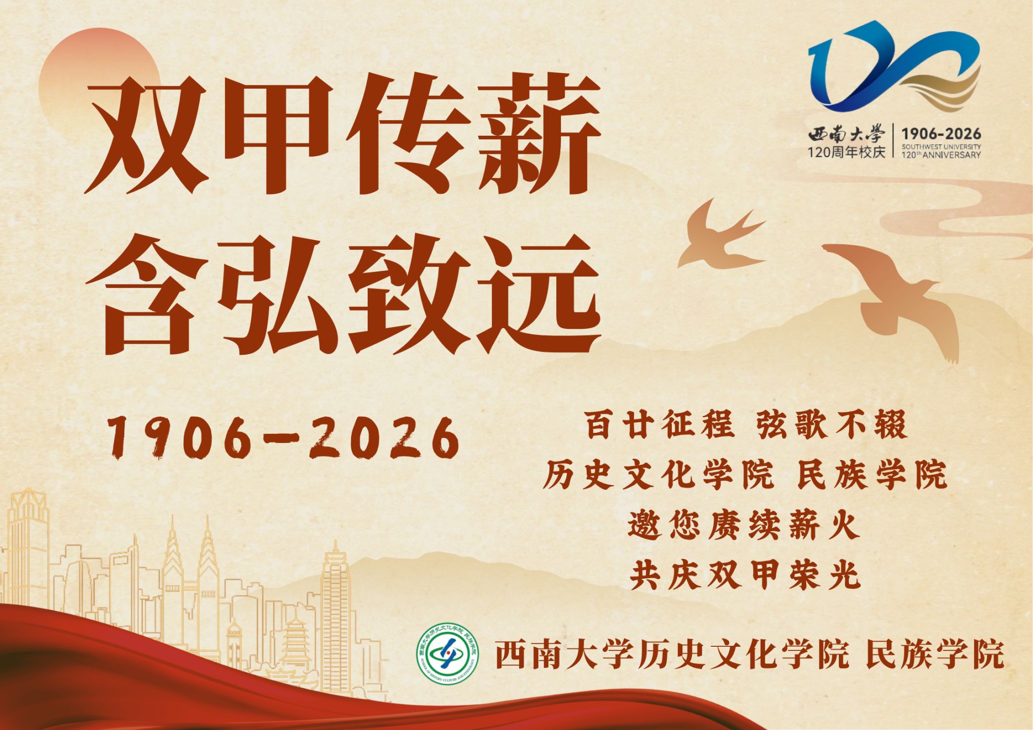 缙云叠翠,杏坛盛事相约重庆;嘉陵扬波,桂苑荣光嘉会西南。春风和煦,百蕙齐芳,2026年4月18日,z6mg人生就是博有限公司将隆重举行120周年校庆。为共纪薪火襄文百廿时序,同启上庠功业双甲华章,诚邀广大员工同庆母校华诞!
